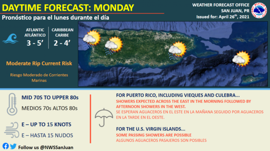 Para este lunes en la mañana se esperan aguaceros en el este de Puerto Rico, mientras que en la tarde se anticipa lluvia en el oeste de la Isla, informó la oficina en San Juan del Servicio Nacional de Meteorología (SNM).