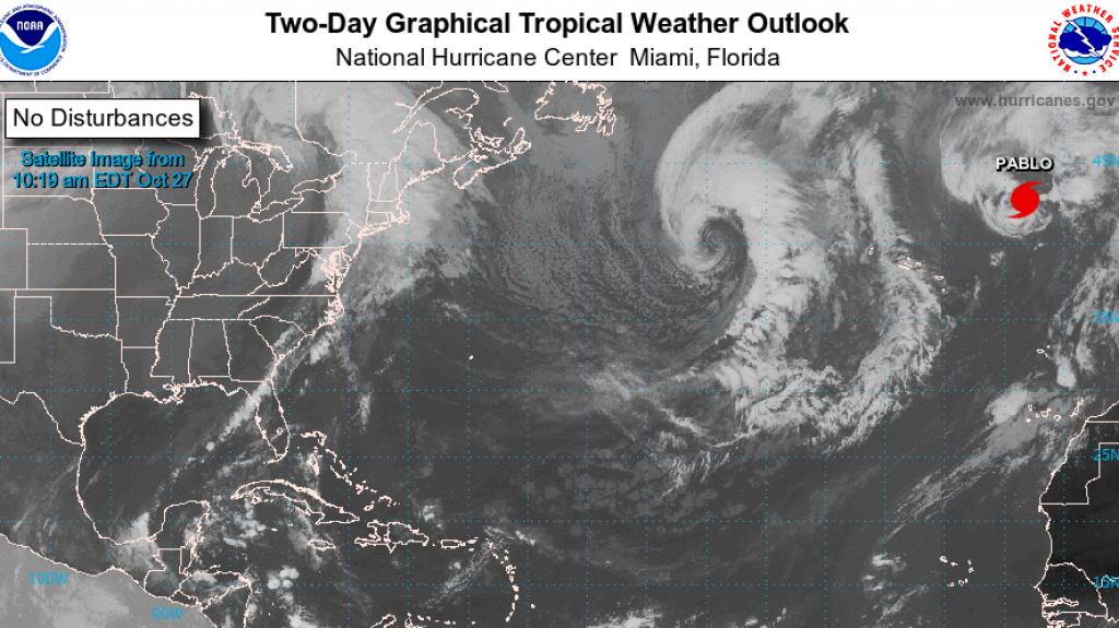 Pablo, un sistema que se desarrolló hacia el noreste del Atlántico, se convirtió esta mañana en huracán categoría 1. Pablo estuvo pasando al sureste de las islas Azores, pero ahora no es de amenaza a territorio. Se espera que el sistema se debilite gradualmente. Entretanto, no hay otros fenómenos desarrollados o con potencial ciclónico.