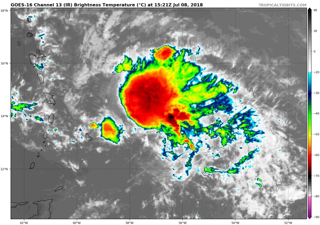 La tormenta tropical Beryl continúa en ruta al Caribe, con vientos de 45 mph. El sistema estará afectando a las islas de Guadalupe y Dominica, esta noche. Una vez cruce al Caribe, el fenómeno continuará perdiendo fuerzas; por tanto, en su punto más cercano a Puerto Rico, hacia la tarde y noche del lunes, el sistema estará en transición de ser degradada a una depresión tropical. En este caso, el sistema debe tener vientos que oscilen entre 35 y 40 mph.