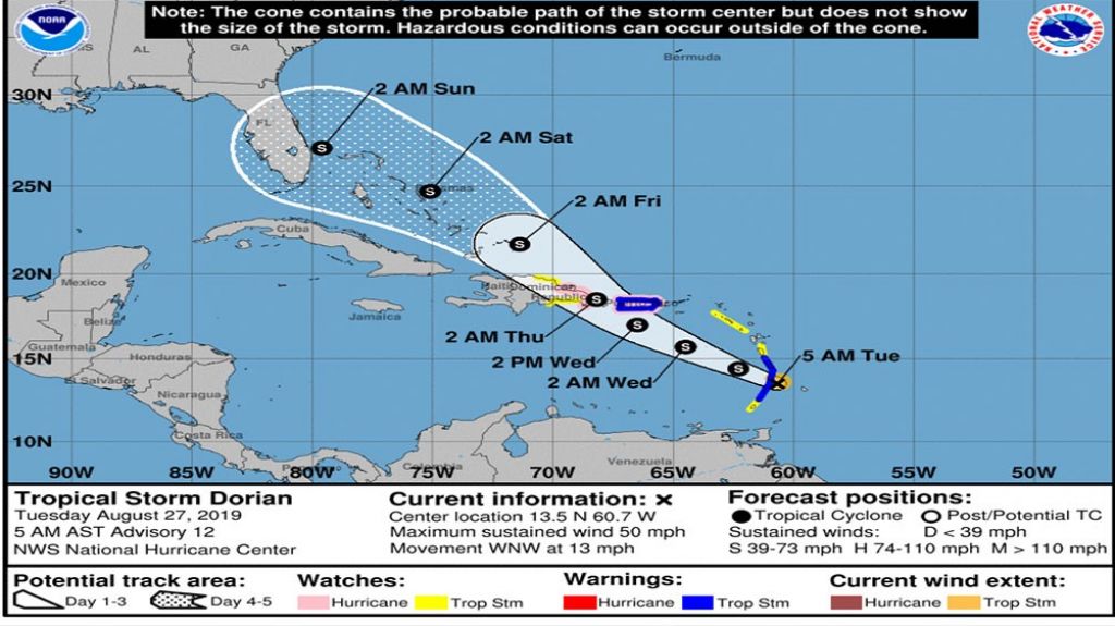 Según el boletín de las 5:00 de la madrugada del Centro Nacional de Huracanes (CNH), el centro de la tormenta tropical Dorian estaba ubicado cerca de la latitud 13.5 grados norte, longitud 60.7 grados oeste. Dorian se mueve hacia el oeste-noroeste cerca de 13 millas por hora (mph) y se espera que el movimiento continúe esta noche, seguido de un giro hacia el noroeste el miércoles.