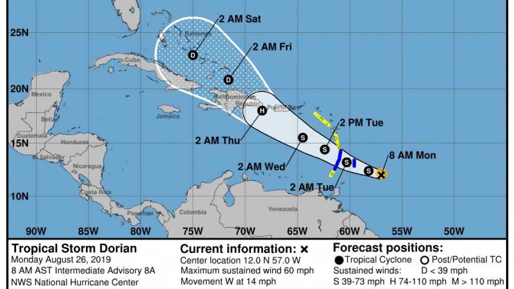 El Centro Nacional de Huracanes reportó que la tormenta tropical Dorian se intensificó, ahora con vientos de 60 mph. Actualmente, Dorian se localiza en la latitud 12.0ºN y longitud 57ºO, moviéndose al oeste a 14 mph. El sistema enfrenta una masa de aire seco que le impide un fortalecimiento rápido. Además, vientos cortantes la afectarán una vez cruce al Caribe, la tarde del martes.