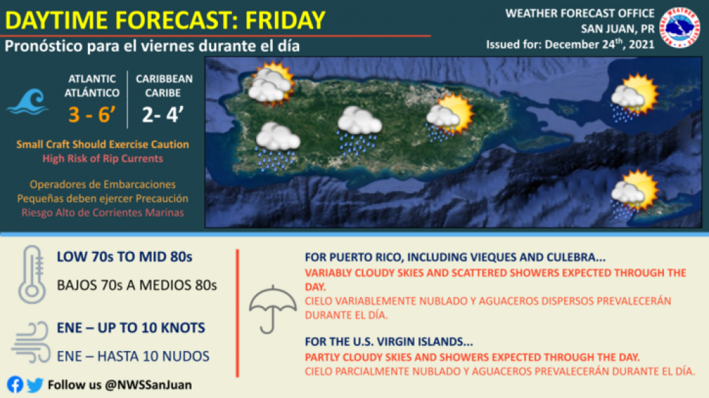 Se espera que la humedad aumente para el día de hoy y se mueva al norte fuera de las aguas del Caribe y al este del Canal de la Mona. Existe la posibilidad de algunas tronadas y aguaceros de lento movimiento que podrían generar inundaciones urbanas localizadas y de pequeños riachuelos. A pesar de estas condiciones, se espera que sea un día nublado, con algunos periodos breves de sol durante el día. Las temperaturas máximas estarán en los bajos a medios 80s en áreas bajas y en la costa norte y este de la isla y para la costa sur y oeste estará de los medios a altos 80s. Las temperaturas máximas en áreas montañosas se esperan que fluctúen entre los medios 60s a los bajos 70s. El viento estará relativamente leve con variación en brisa marina prevaleciendo luego de media mañana.
