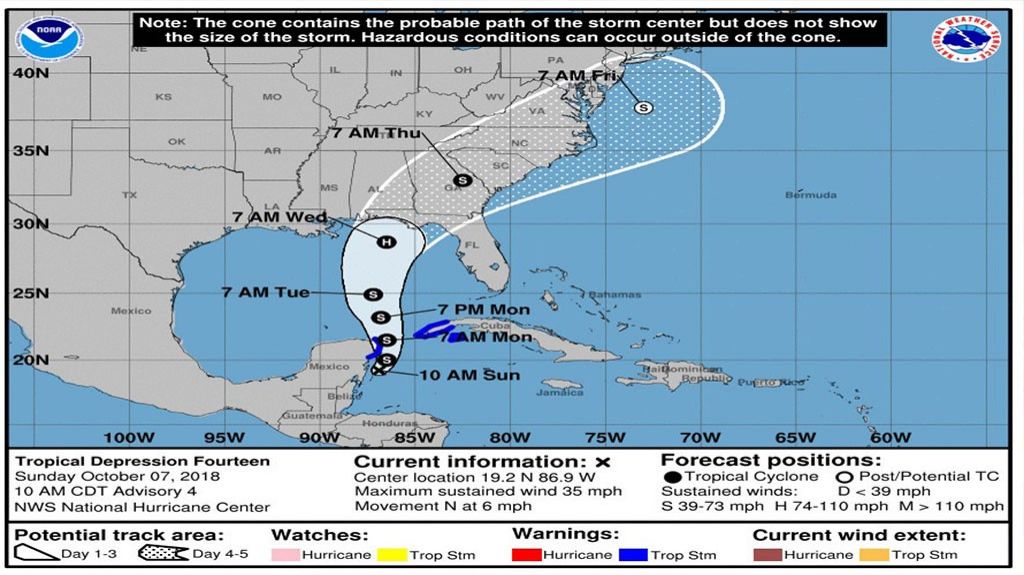 La entidad con sede en Miami pronostica que Michael se moverá sobre el Canal de Yucatán el lunes, luego a través del Golfo de México oriental hasta el martes por la noche, y se acercará a la costa noreste del Golfo el miércoles.