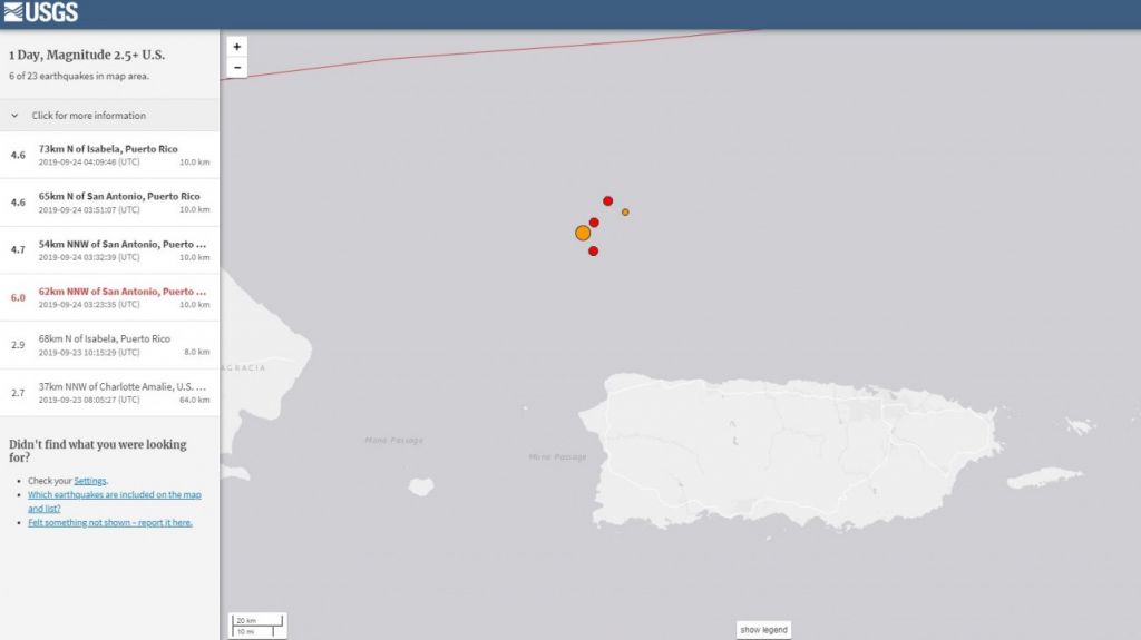Una serie de temblores se reportó a partir de las 11:23 de la noche de hoy. A esa hora, un sismo de magnitud 6.0 se reportó a unos 79 km de Isabela. Nueve minutos más tarde (11:32 pm), otro de magnitud 4.7 se manifestó en la misma zona. Otros dos con magnitudes 4.6 y un sismo de magnitud 2.9 también se registraron. En total, han sido 5 los sismos.
