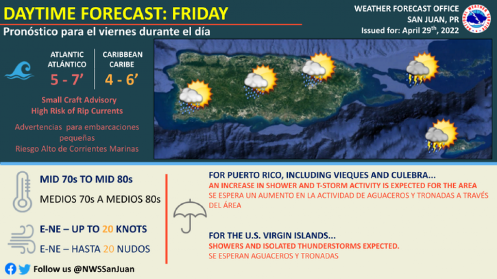 Mayormente condiciones de buen tiempo continuarán hasta temprano en la tarde. Sin embargo, un incremento gradual en actividad de aguaceros se espera ya avanzada la tarde, mayormente sobre el área este Puerto Rico y las islas locales.