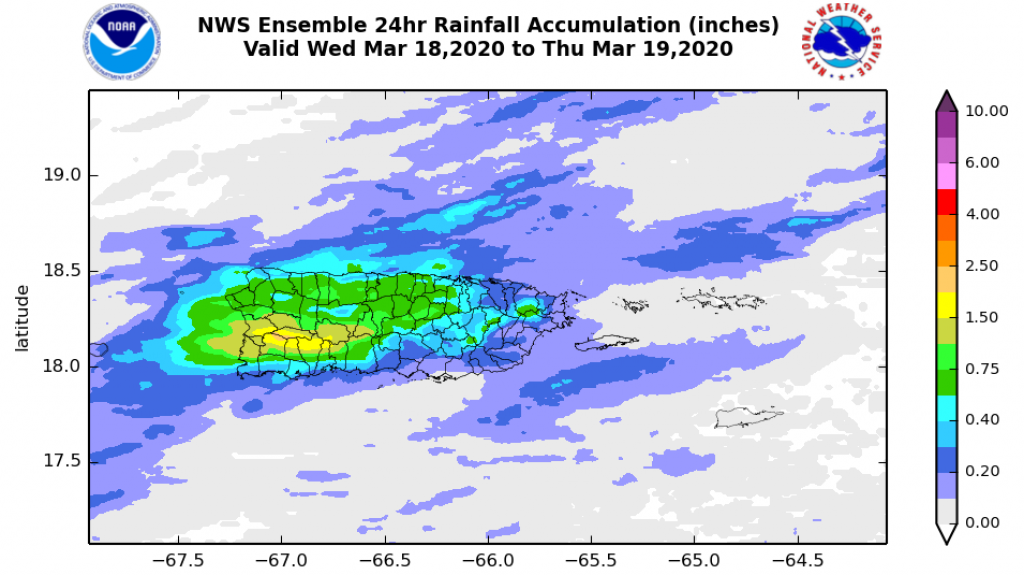Una vaguada se mueve a través de nuestra isla, generando tiempo mayormente nublado y un incremento en precipitaciones. Como resultado, aguaceros pasajeros continuarán llegando hacia municipios de la mitad norte del país, incluyendo el área metropolitana, centro y sectores del este. Éstos no generan acumulaciones significativas dado a que se desplazan bastante rápido. En cambio, el resto del país manifiesta nubosidad variable, pero más tarde se desarrollarán numerosos aguaceros hacia municipios del oeste-interior y suroeste. El área de mayor potencial será entre Utuado-Mayagüez-Cabo Rojo y Yauco. Tenga precaución ante la posibilidad de inundaciones.