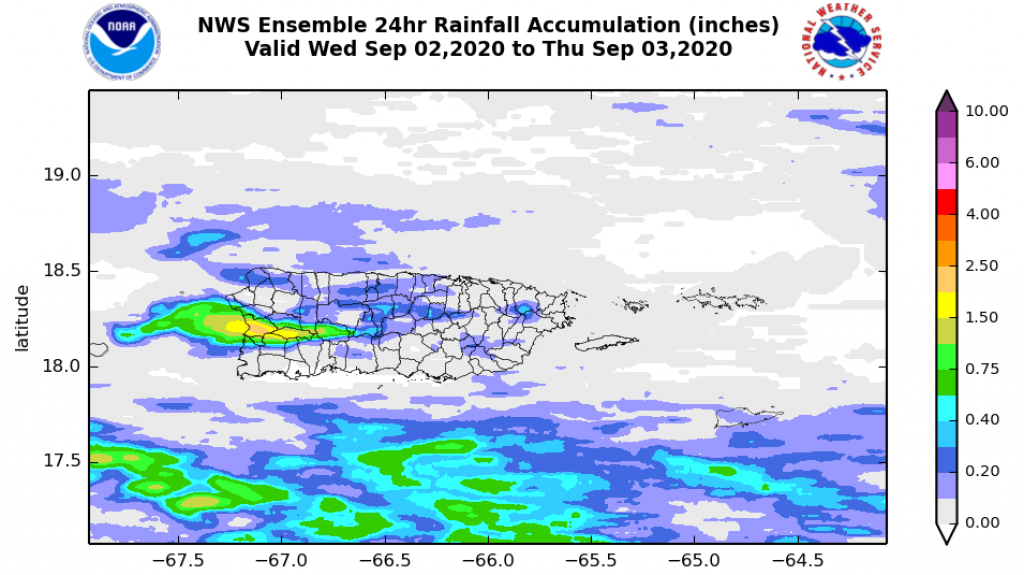 Una masa de aire seco y ligeramente brumoso se ubica hacia el este y norte de la Isla, pero hay humedad al sur de la región. Esa humedad en combinación con el intenso calor contribuirá al desarrollo de aguaceros en la tarde hacia el interior-sur y oeste de Puerto Rico. El mayor potencial será para los municipios entre Adjuntas y Mayagüez.