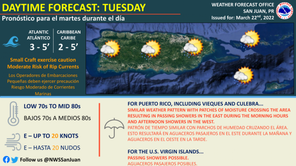 El cielo se tornará de mayormente soleado a variablemente nublado durante el resto del día a medida que un área de mayor humedad se mueva por toda la región. Algunos aguaceros podrían afectar el este interior y sureste el resto de la mañana, luego el calentamiento diurno y los efectos locales contribuirán al desarrollo de aguaceros durante la tarde a través de la Cordillera Central y áreas del oeste de Puerto Rico. Los vientos estarán del noreste entre 10 y 15 mph con ráfagas más fuertes en ocasiones y variaciones en la brisa marina a través de las áreas costeras.