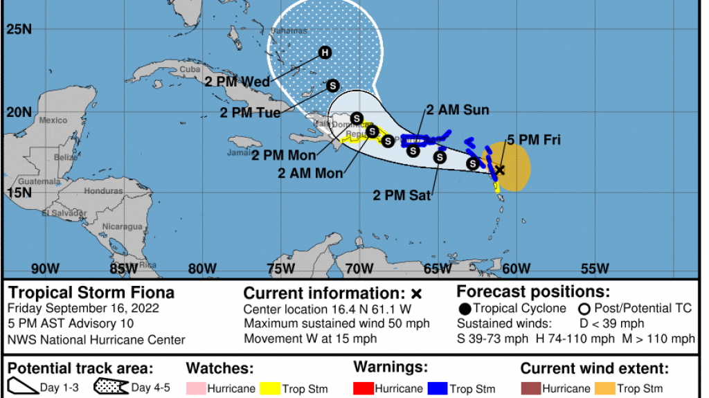 El Centro Nacional de Huracanes (CNH), en Miami, ubicó en el boletín de las 5:00 de la tarde el centro de la tormenta tropical Fiona cerca de la latitud grados 16.4 Norte, longitud grados 61.1 grados Oeste.