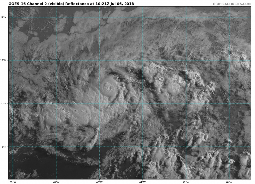 Beryl se convirtió, esta madrugada, en el primer huracán de esta temporada, ahora con vientos de 75 mph. Esta se ubica en la latitud 10.6°N y longitud 45.1°O, moviéndose al oeste a 14 mph.
