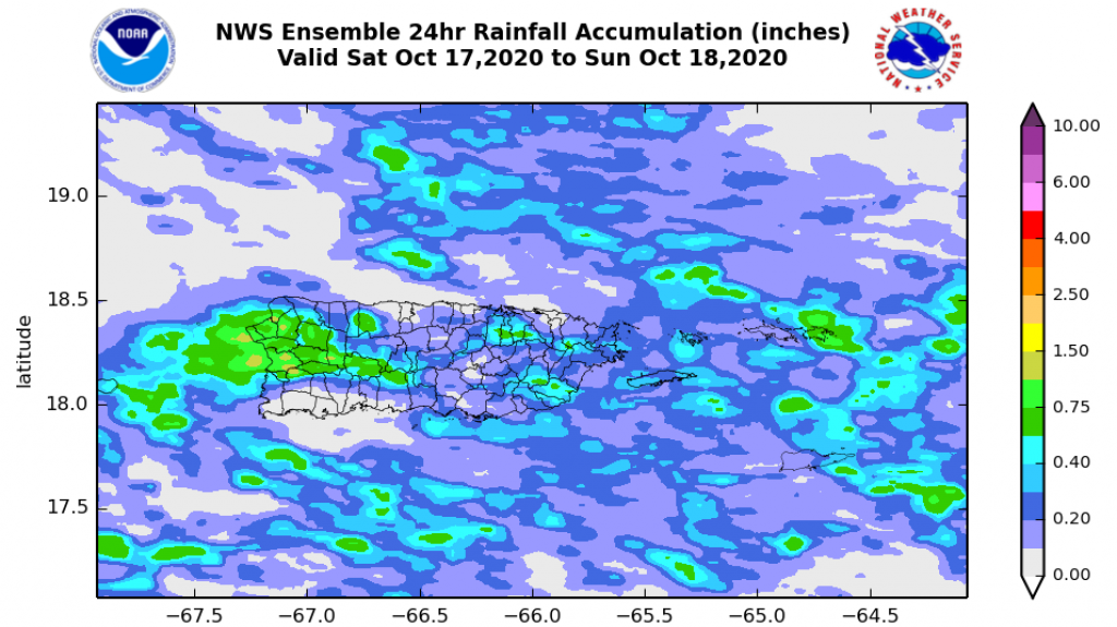 El resto del país no registra precipitación; sin embargo, más tarde observaremos la formación de intensas lluvias y tormentas eléctricas a través del interior y mitad oeste de la Isla. De hecho, se extendió la vigilancia de inundaciones para toda la Isla hasta la noche de hoy, sábado.