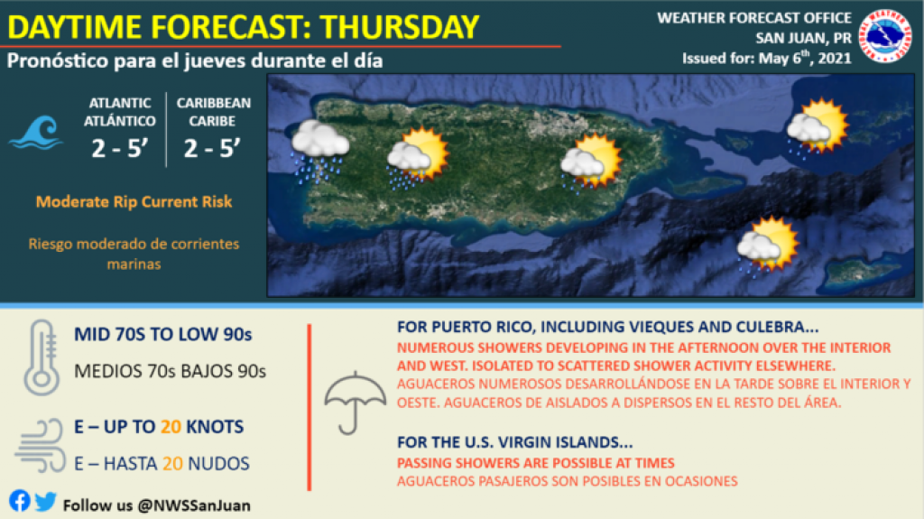 Para este jueves en la tarde se esperan aguaceros numerosos sobre el interior y oeste de Puerto Rico, y lluvia dispersa en el resto del área, informó la oficina en San Juan del Servicio Nacional de Meteorología (SNM).