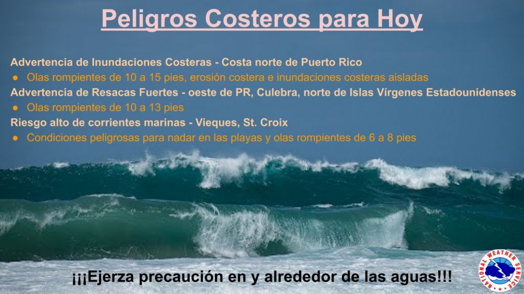 Las condiciones marítimas continuarán deterioradas hoy. Existe una Advertencia de Inundaciones Costeras para el norte de Puerto Rico hasta esta tarde. Adicionalmente, Advertencia de Resacas Fuertes y Riesgo Alto de corrientes marinas sigue en efecto.