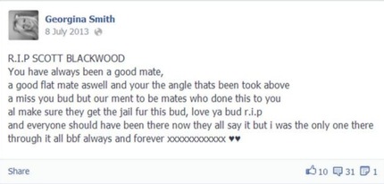 Georgina Smith, de 22 años, publicó en la página de Scott Blackwood que "había sido siempre un buen compañero" y prometió que los responsables de su asesinato serían capturados, informa el diario británico 'Metro'.