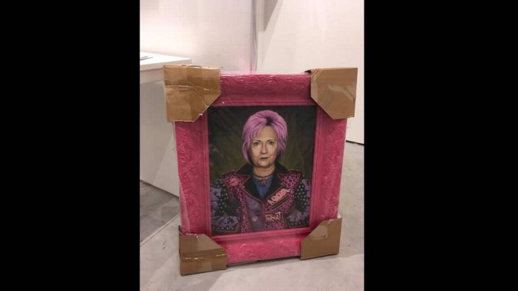 La pintura titulada"Punk Hillary” se envió con una pintura similar del presidente Donald Trump (titulada"Trump Pimp”),donde aparece el primer mandatario con un sombrero pintado como si fueran las rayas de una cebra y una cadena de oro con un letrero de dólar colgada del cuello. La pintura de Trump se había retirado de la caja antes del registro de seguridad.