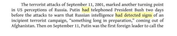 "Putin había telefoneado al presidente Bush dos días antes de los ataques para advertir que la inteligencia rusa había detectado signos de una incipiente campaña terrorista, 'algo largo en preparación', que provenía de Afganistán", indica Beebe en su libro.