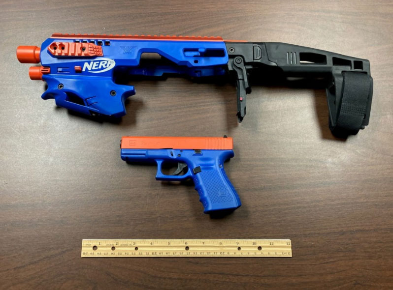 Según los diputados, esta pistola era un rifle convertido con un cargador de tambor de cincuenta rondas y había sido alterado para que pareciera una pistola de juguete Nerf. Las fotos compartidas por los agentes muestran que el cuerpo de la Glock estaba pintado de azul y naranja, encajando en un archivo adjunto con el logotipo de Nerf. La punta del accesorio incluso parece que podría ser un juguete. Lo único que sobresalió fue la parte trasera del accesorio, que no se había pintado para que coincidiera con el esquema de color de Nerf. CCSO dijo en su comunicado de prensa que esto no es necesariamente ilegal, pero es algo que les preocupa.