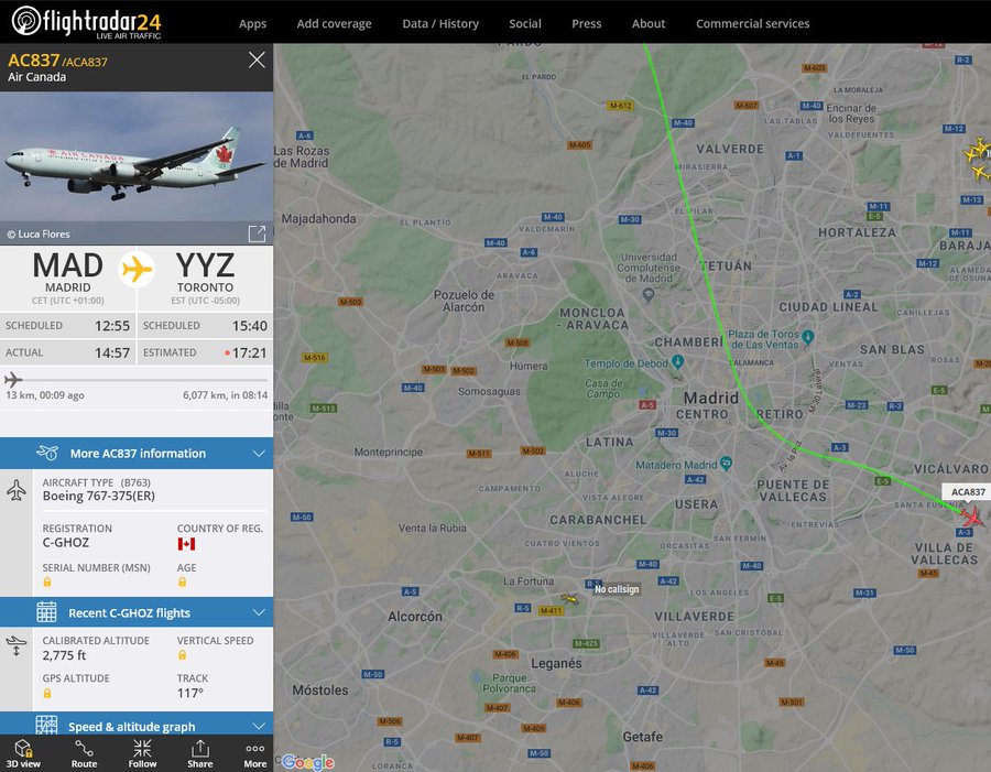"Acaba de pasar por encima de mi casa en la zona norte de Madrid un avión de Air Canada y volaba realmente bajo", publicó en Twitter uno de los vecinos que avistó el avión, destacando que "el ruido ha sido tremendo" y asegurando que se trata de un vuelo "con destino a Toronto" .