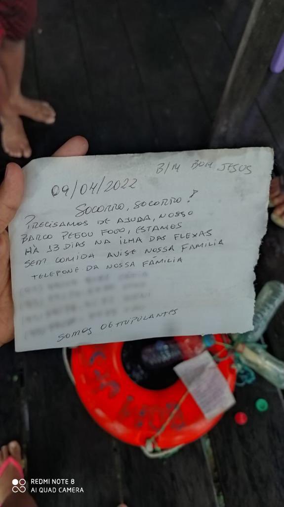 "¡Ayuda! ¡Ayuda! Necesitamos ayuda. Nuestro bote se incendió. Llevamos 13 días en la isla de Flecxas, sin comida. Avisen a nuestra familia", decía la nota escrita por los náufragos, que también incluía los teléfonos de contacto de sus parientes.