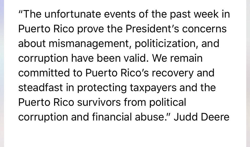 "Los eventos desafortunados de la semana pasada en Puerto Rico prueban que las preocupaciones del presidente acerca de la mala administración, politización y corrupción han sido válidas. Continuamos comprometidos con la recuperación de Puerto Rico y firmes en proteger a los contribuyentes y sobrevivientes en Puerto Rico de la corrupción política y abuso financiero”, sostuvo Deere en una breve expresión escrita.