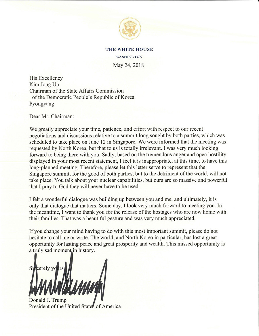 "Lamentablemente, con base en la tremenda rabia y abierta hostilidad mostradas en su declaración más reciente, creo que es inapropiado, en este momento, tener esta reunión largamente planificada", escribió Trump en una carta publicada este jueves por la Casa Blanca.