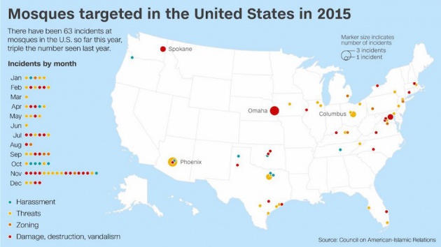 Solo en noviembre de este año se vieron 17 incidentes contra los musulmanes en las mezquitas, y la vehemencia va en aumento después de que los terroristas alineados con el Estado Islámico mataran a 130 personas en París. Las amenazas de muerte y los casos de vandalismo aumentaron de nuevo después del 3 de diciembre, cuando una pareja musulmana mató a 14 personas e hirió a 21 personas más en San Bernardino, California. Curiosamente, no hubo aumento después de uno de los primeros ataques terroristas destacados del año contra la revista Charlie Hebdo en París, el 7 de enero.