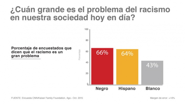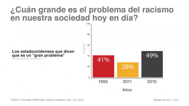 Alrededor de las dos terceras partes de los negros (66%) y de los hispanos (64%) dijeron que el racismo es un gran problema, mientras que poco más de cuatro de cada 10 (43%) de los blancos dijo lo mismo. Hay más hispanos hoy que expresan que el racismo es un gran problema que en 1995, cuando menos de la mitad lo creía así. Entre los negros, la proporción de los que ven el racismo como un gran problema cayó de 68% en 1995 a 50% en 2011, pero ahora ha subido a 66%.
