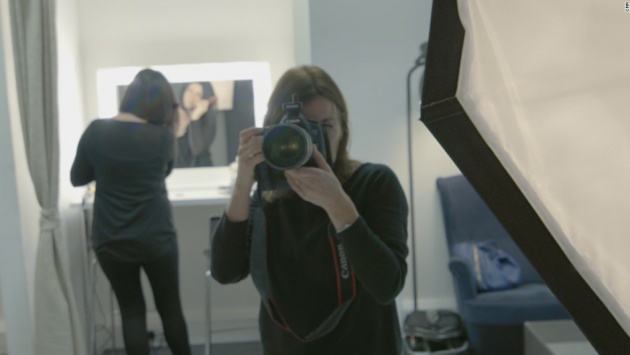 Sin embargo, ella llega a un estudio, se quita el suéter, luego su blusa y por último su sostén, y sin vacilación ni vergüenza desnuda sus pechos para una fotógrafa.