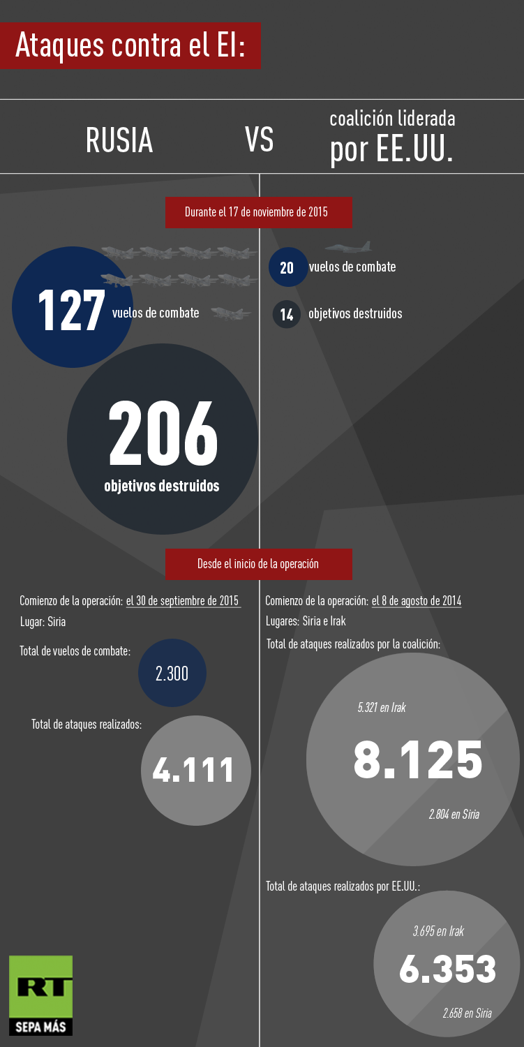 El 17 de noviembre, la coalición internacional encabezada por EE.UU. realizó 20 vuelos de combate y destruyó 14 objetivos del Estado Islámico en Siria, mientras que los aviones de la Fuerza Aérea rusa llevaron a cabo 127 vuelos y acabaron con 206 posiciones yihadistas.