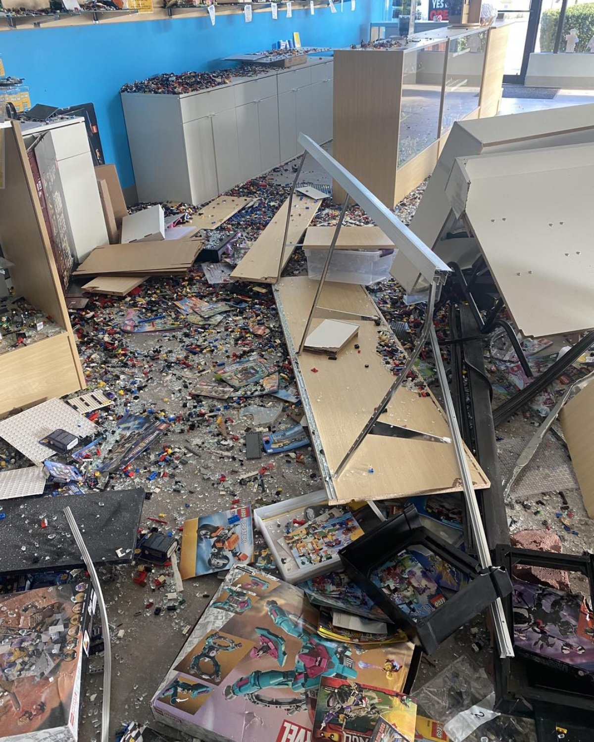 Los propietarios de la tienda, Nathan y Julia, relataron a los medios locales que la camioneta embistió con fuerza contra un conjunto de exhibidores nuevos sin ensamblar, lo que causó que estos cayeran sobre las amplias mesas repletas de ladrillos sueltos y valiosas minifiguras. El resultado inmediato fue una mezcla caótica de ladrillos y vidrios rotos.