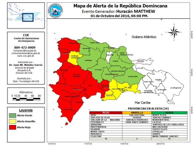 El Centro de Operaciones de Emergencias (COE) mantuvo a dos provincias en alerta amarilla y aumentó a 12 las zonas en verde por los efectos del huracán Matthew, que descendió hoy a categoría 4.