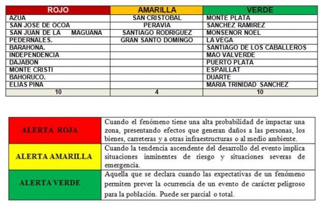 Las provincias en alerta amarilla son Pedernales y Barahona, mientras que en alerta verde se encuentran San Cristóbal, Peravia, Azua, San José de Ocoa, Elías Piña, Independencia, Bahoruco, San Juan de la Maguana, el Gran Santo Domingo, Santiago Rodríguez, Monte Cristi y Dajabón.