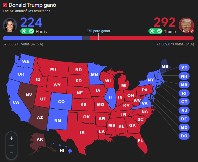 Donald Trump, expresidente y candidato del Partido Republicano a la Presidencia de Estados Unidos, se ha proclamado ganador de las elecciones presidenciales mientras el recuento de votos aún continúa. Trump lidera en el conteo y ha superado el umbral necesario de 270 votos electorales según las proyecciones. "Quiero agradecer al pueblo estadounidense el extraordinario honor de haber sido elegido su 47.º presidente y su 45.º presidente", expresó Trump.