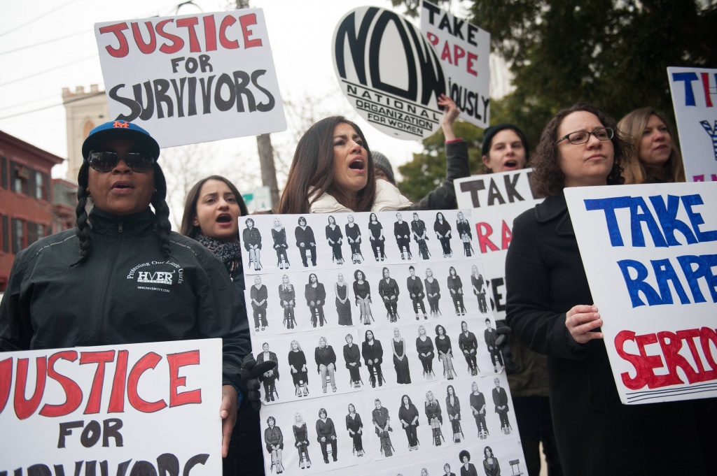La mujer comenzó su protesta quitándose una cazadora negra para, a continuación, saltar una valla y plantarse ante Cosby con el puño en alto, mientras en su cuerpo aparecía pintado el lema "los derechos de las mujeres importan" y nombres de mujeres que hacían referencia a aquellas que han acusado de abusos sexuales al actor.