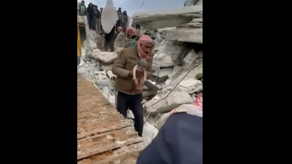 Una mujer dio a luz un bebé entre los escombros dejados por el terremoto en la ciudad de Alepo, Siria. Como se puede ver en el video, un hombre, que brindó asistencia en el parto, saca al recién nacido de entre los escombros mientras aún le cuelga el cordón umbilical que lo unía a su madre, quien murió junto con el resto de su familia, informan medios locales.