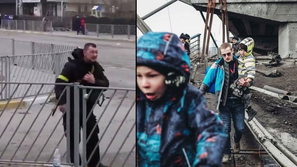 Los civiles que cruzan el puente hacia Kiev forman pequeños grupos y juntos corren unos 100 metros mientras están potencialmente expuestos al fuego ruso. Los soldados ucranianos corren junto a los civiles para ayudarlos y luego regresan para refugiarse detrás de un muro de bloques de hormigón.