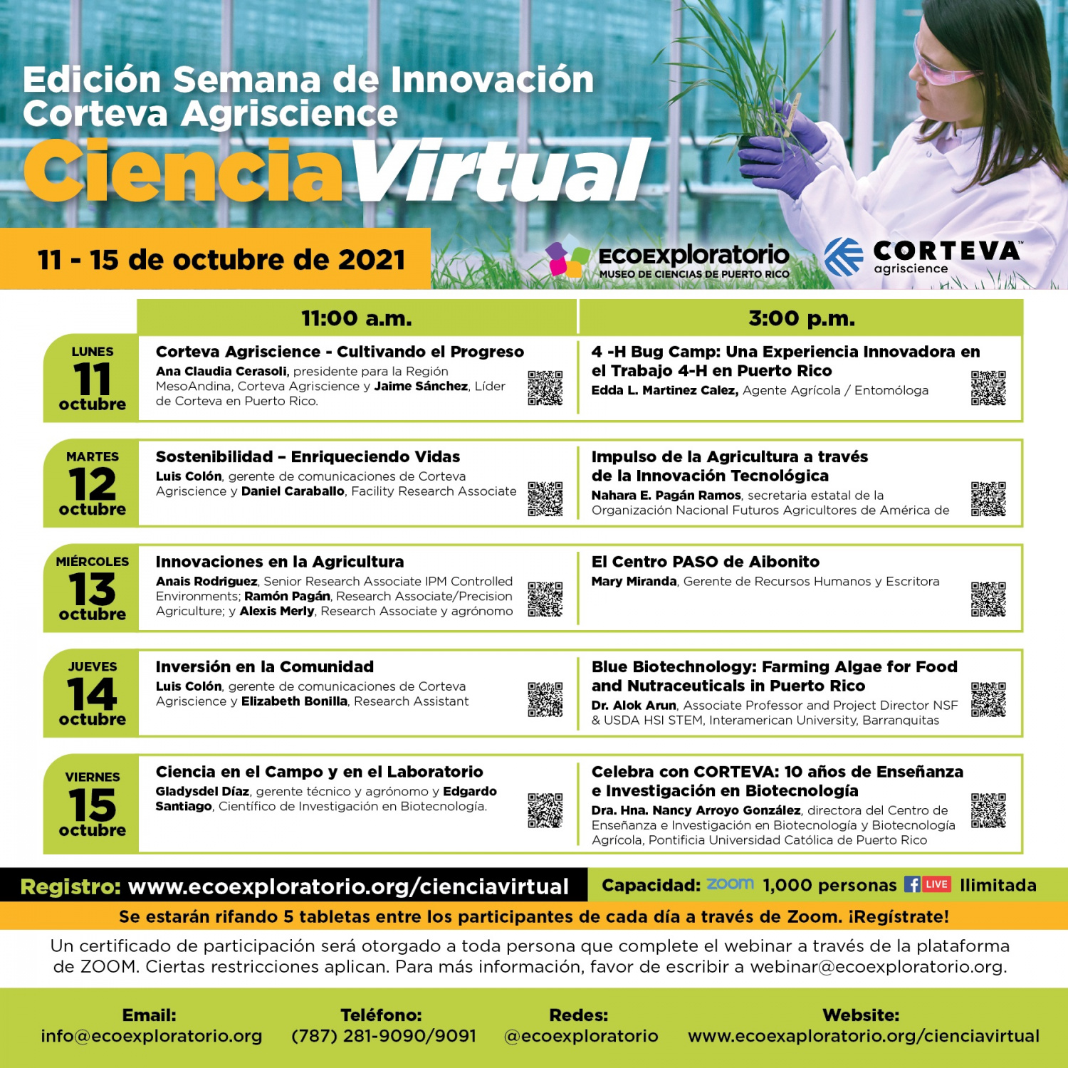 El registro y participación en el evento es gratuito en www.ecoexploratorio.org/cienciavirtual , con una capacidad máxima de mil personas por día. Además, los interesados también podrán ver las charlas por Facebook Live en la página del EcoExploratorio (@ecoexploratorio) y Corteva Agriscience Puerto Rico (@CortevaPuertoRico).