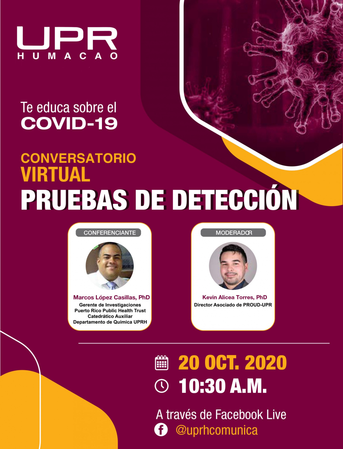 El primer conversatorio, "Pruebas de detección de Covid-19”, se llevará a cabo el martes 20 de octubre, e iniciará con un resumen estadístico y datos relevantes de la pandemia en Puerto Rico. Se dará una visión general de los distintos tipos de pruebas de detección que existen hasta la fecha, y culminará con preguntas para atender las inquietudes de la comunidad.