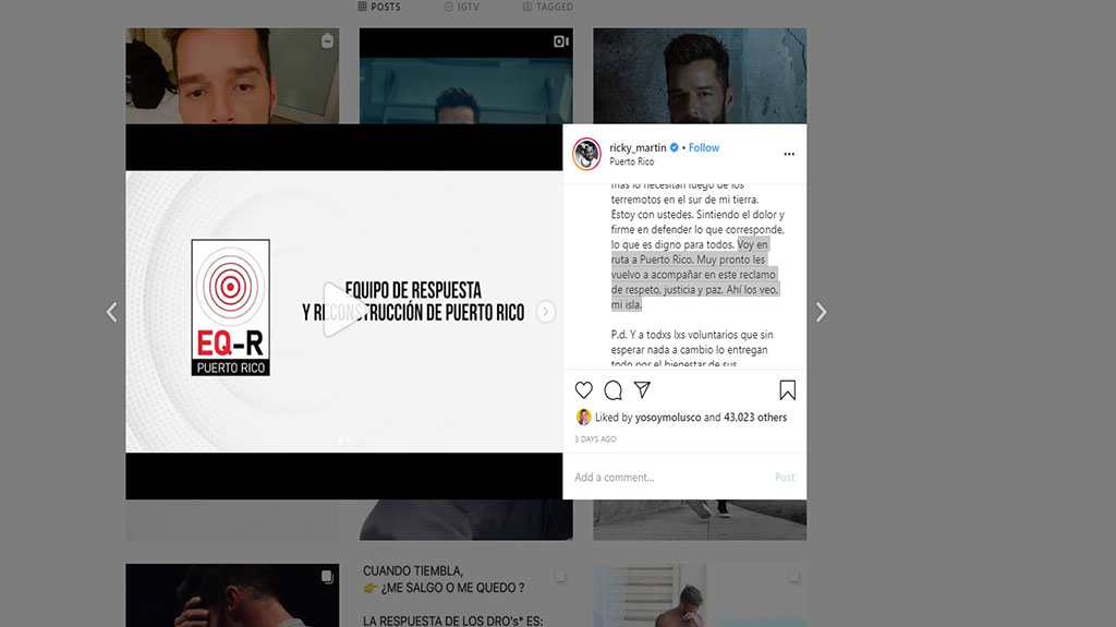 "Voy en ruta a Puerto Rico. Muy pronto les vuelvo a acompañar en este reclamo de respeto, justicia y paz. Ahí los veo, mi isla.” Fue el mensaje que publico Ricky Martin en sus redes sociales asegurando que se unirá a las protestas.