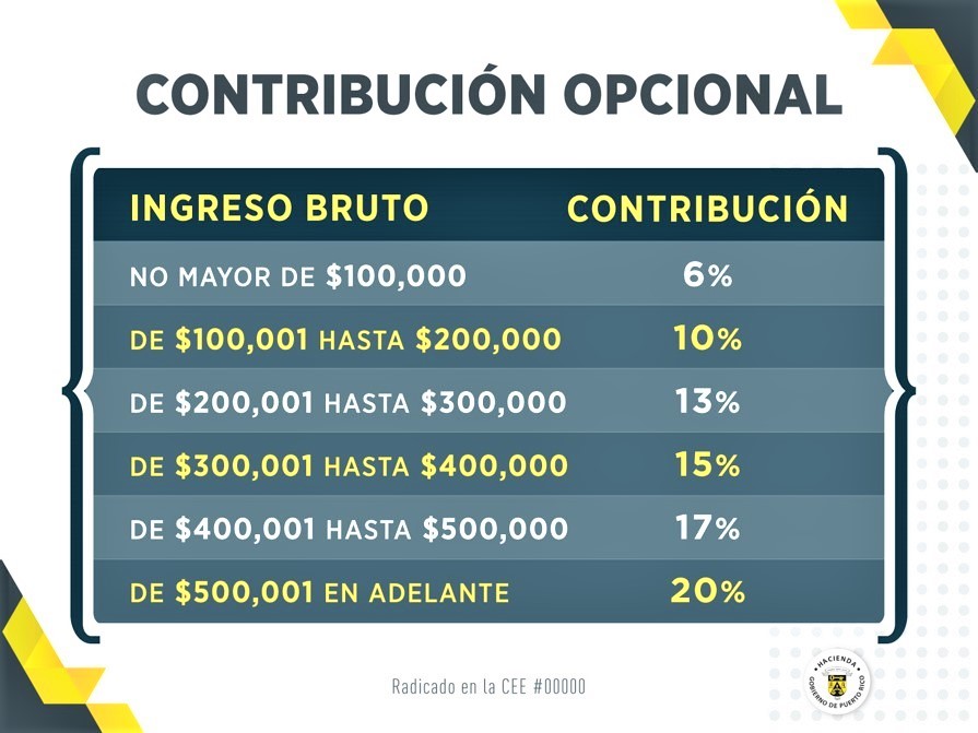 La contribución opcional se realiza sobre el ingreso bruto, sin deducciones y sin exenciones personales o por dependientes, y se paga, a opción del contribuyente, a una tasa preferencial que fluctúa entre el seis y el 20 por ciento, dependiendo del total del ingreso bruto generado durante el año contributivo.
