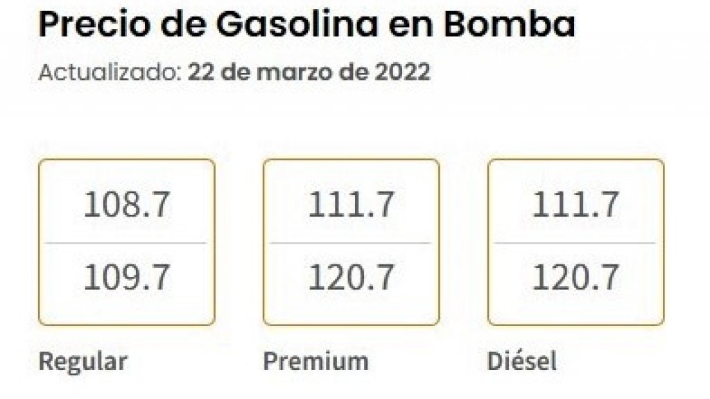 El precio recomendado en bomba para la regular es de entre 108.7 y 109.7; para premium, 111.7 y 120.7; y para el diésel, de entre 111.7 y 120.7. INS
