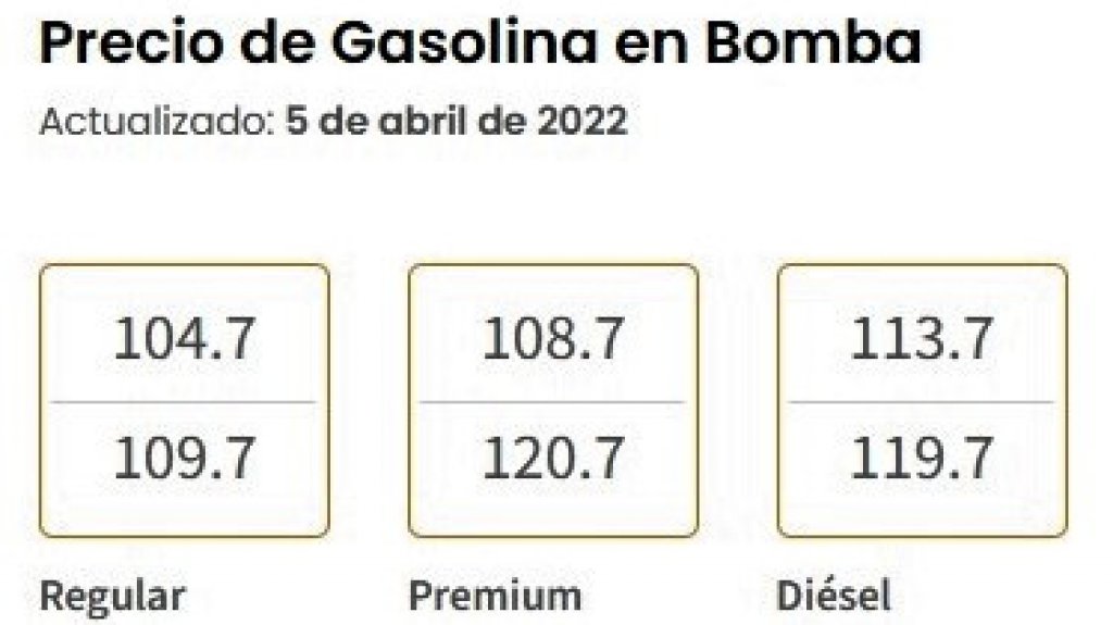 De esta manera, para hoy el precio recomendado en bomba para la gasolina regular es de entre 104.7 (era de 102.7) y 109.7 (ayer, 108.7); para premium, de entre 107.7 (hasta ayer, 108.7) y 120.7 (era de 119.7); y para el diésel, de entre 113.7 (antes, 110.7) y 119.7 (era de 116.7).