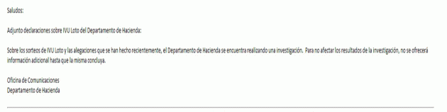 " Sobre los sorteos de IVU LOTO y las alegaciones que han hecho recientemente, el departamento de Hacienda se encuentra realizando una investigación. Para no afectar la investigación no se ofrecerá información adicional hasta que la misma concluya".