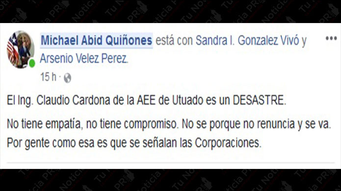 El representante Abid Quiñones arremetió contra el director de la Unidad Técnica de la Autoridad de Energía Eléctrica (AEE) de Utuado, Claudio Cardona y pidió que "se vaya para su casa” ante la dilación en las labores de energización de los clientes que siguen sin luz después del huracán María.