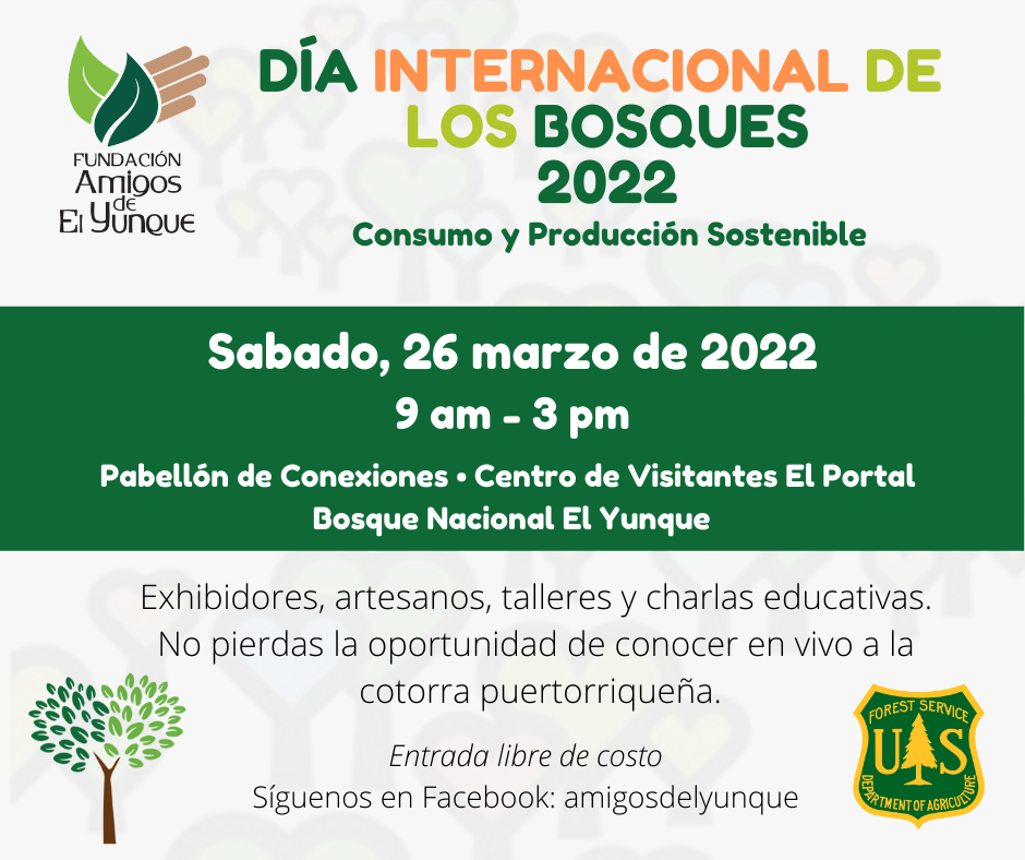 La Fundación Amigos de El Yunque (FADEY) junto al Servicio Forestal Federal celebrarán este sábado, 26 de marzo de 2022, el Día Internacional de los Bosques, en el recién inaugurado centro de visitantes El Portal, en Río Grande.