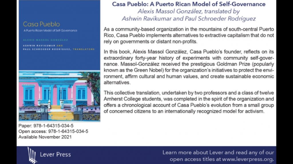 "Casa Pueblo: A Puerto Rican Model of Self-Governance” ("Casa Pueblo: Un modelo puertorriqueño de autogobernanza”) es el título de la traducción que acaba de ser publicada por Lever Press del libro escrito por Alexis Massol González.