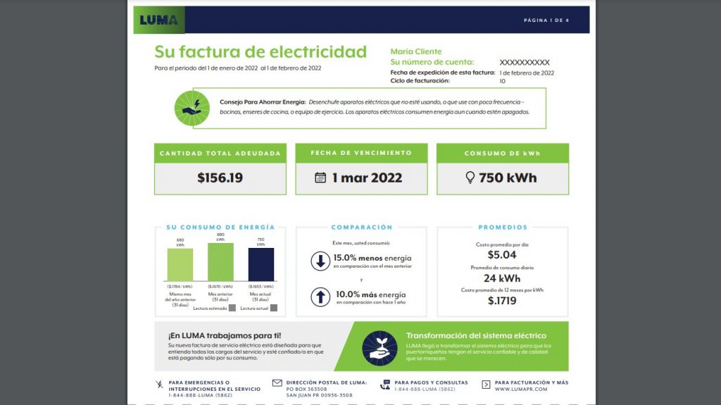 Los clientes de LUMA Energy podrán recibir la factura rediseñada a partir del 4 de marzo de 2022, y casi todos los clientes la recibirán el 31 de marzo de 2022.