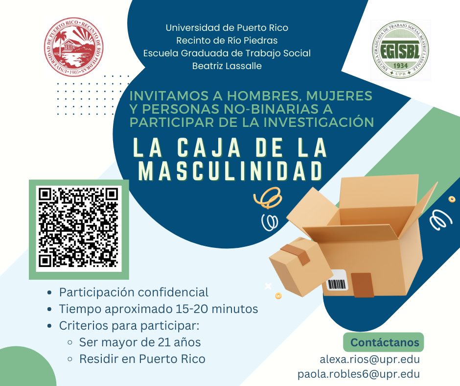 Alexa Ríos López y Paola Robles Rivera, estudiantes de la Escuela Graduada de Trabajo Social Beatriz Lassalle de la Universidad de Puerto Rico, Recinto de Río Piedras, están llevando a cabo un estudio de maestría centrado en las masculinidades en Puerto Rico y te invitan a ser parte de esta investigación innovadora.