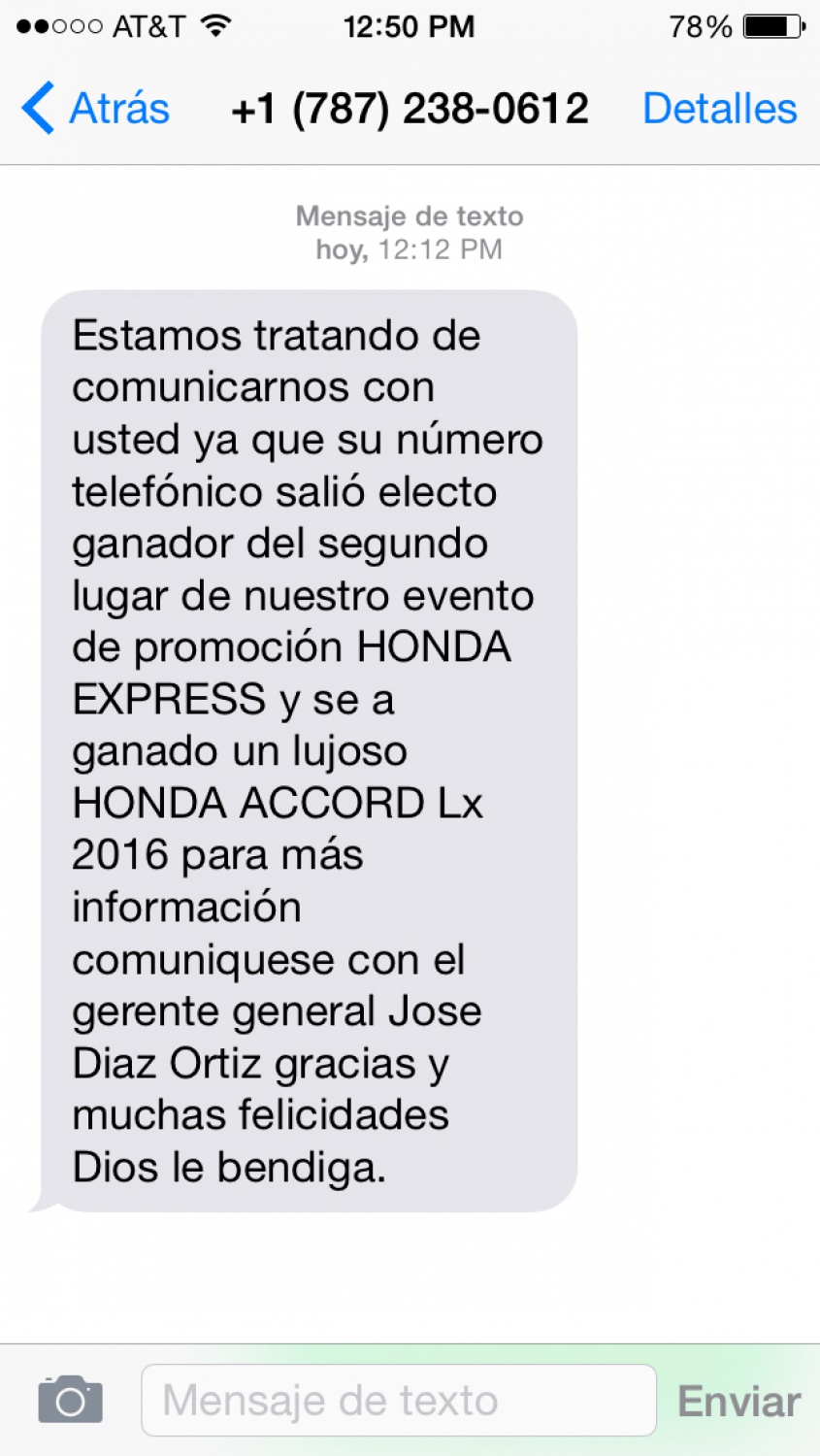 A la persona se le indicó que se ganó "un lujoso Honda Accord LX del 2016” y le piden que para mayor información debe comunicarse con un José Díaz Ortiz, a quien identifican como gerente general.