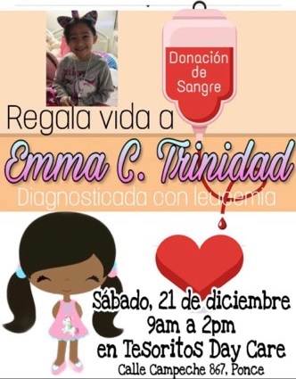 La niña Emma C. Trinidad, quien fue diagnosticada con leucemia necesita de la comunidad de Ponce y el sur por lo que este sábado, se llevará a cabo una donación de sangre.
